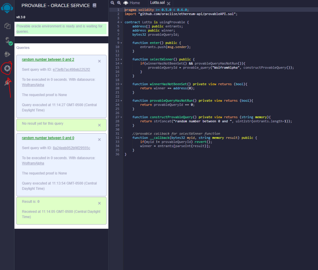 Since we’re using the Provable API as our random number oracle (see part 2 for more details), we can use the provable ethereum bridge, truffle, and solidity events to simulate the conclusion of the lottery where an oracle is called and a winner is selected.