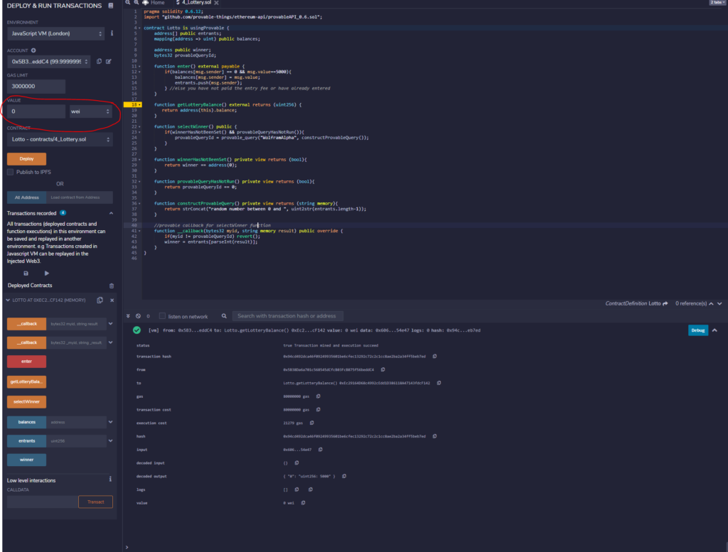 Most of this code should be fairly self-explanatory (I hope). If you want to know more, or wish to learn how to use the Remix IDE, check out the whole series starting from part 1 (Ethereum Lottery Example Part 1: Setting Up Environment).